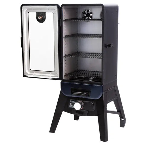 With the Pit Boss Analog Electric Smoker, you can reach temperatures as low as 100°F and as high as 325°F thanks to the double walled cabinet and 1650 watts of power. With built in controls that are simple to use, you’ll have your unit up and smoking in no time. The ability to infuse flavor into your smoker is easy with the oversized front load wood chip tray, offering up to two hours of cooking time per load. The large viewing window eliminates the need for peek-a-boo cooking and its elevated frame makes transferring your meal from the smoker to the table a breeze. The Pit Boss 3 Series Analog Electric Smoker features 3.2 cubic feet of cooking space, three porcelain coated cooking racks, an analog meat probe, and an external heat indicator. The rear wheels and handle increase mobility, and a stylish Dark blue hammered finish is sure to “wow” the crowd. Whether you’re new to smoking or an expert, experience how Pit Boss is redefining the smoker industry in your own backyard today!